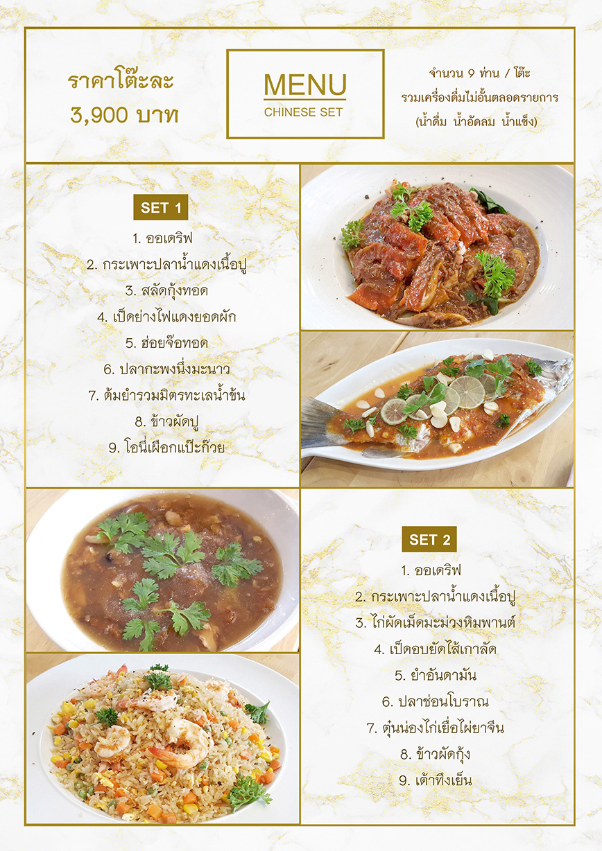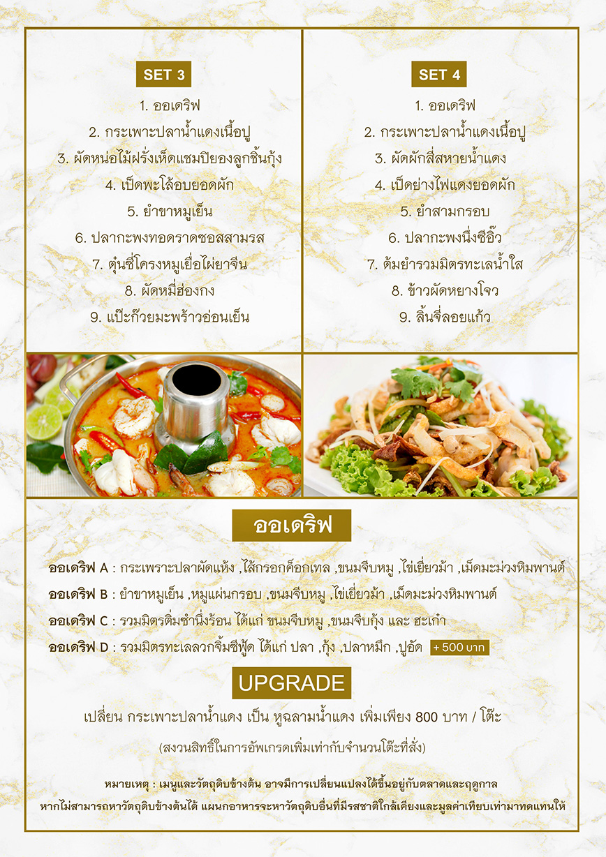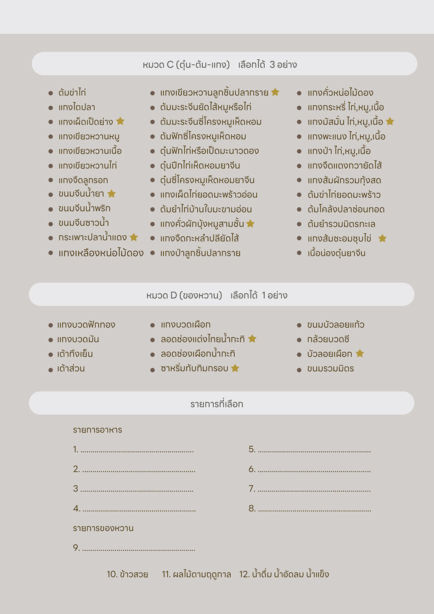 หมายเหตุ : เมนูและวัตถุดิบข้างต้น อาจมีการเปลี่ยนแปลงได้ขึ้นอยู่กับฤดูกาลหากไม่สามารถหาวัตถุดิบข้างต้นได้ แผนกอาหารจะหาวัตถุดิบอื่นที่มีรสชาติใกล้เคียงและมูลค่าเทียบเท่ามาทดแทนให้